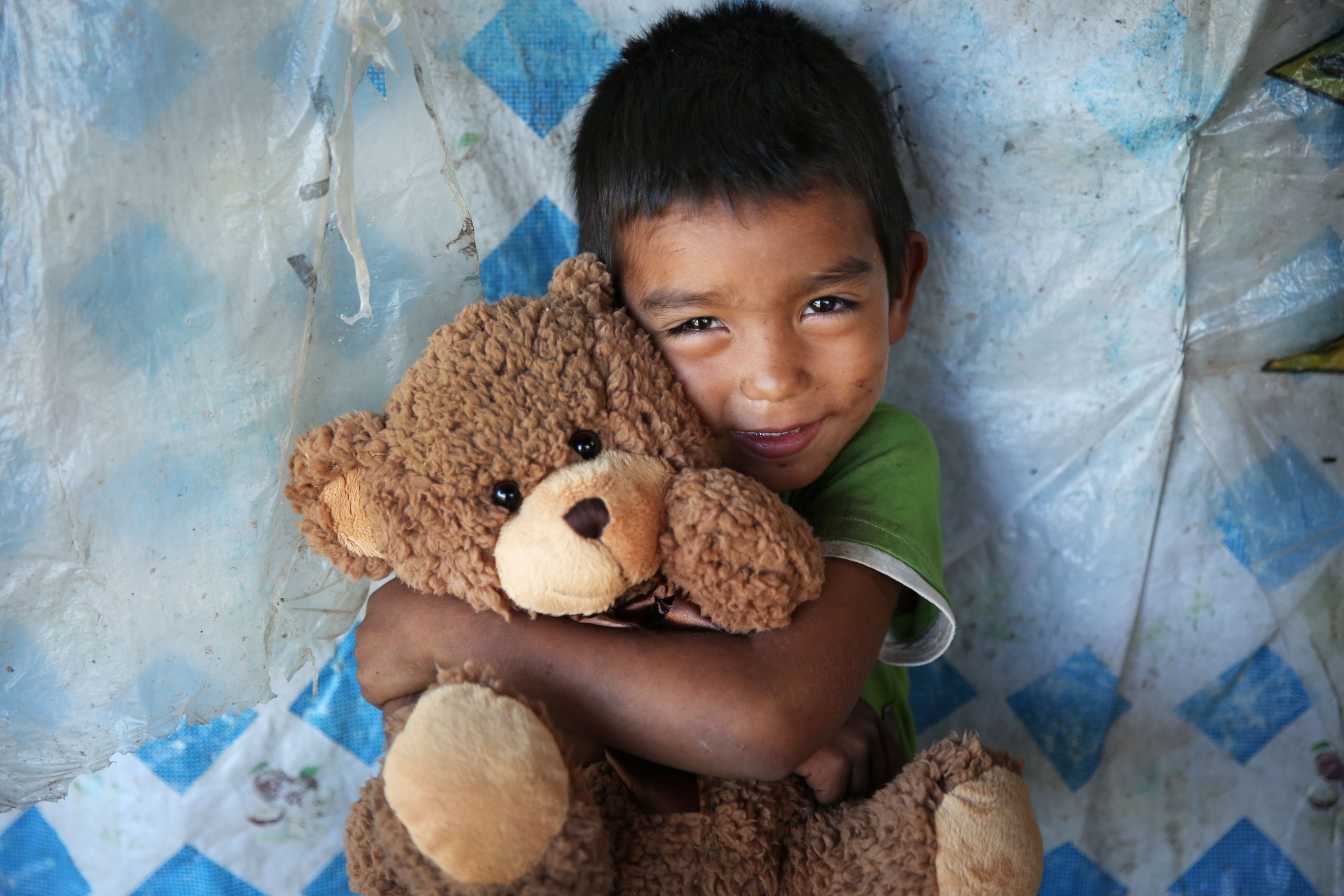 Erickson, 4 from Nicaragua, embraces his new teddy bear which he named “Osito” (little bear), thanks to the generosity of donors that donated toys to the Food For The Poor Christmas Toy drive.